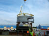 | Heat exchangers fabricated in Canada are shipped to site in a special self-loading ship. The exchangers are stored below deck. Cargo covers are in the process of being removed in the photo on the right. The exchangers were shipped without the tubes installed due to weight limitations. The exchangers will be off-loaded by the ship's crane onto the waiting trucks. | ||